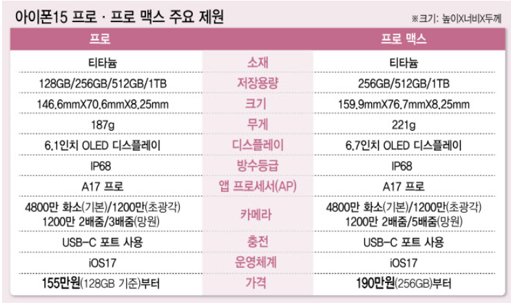 아이폰 15, pro, promax 모두 가격은 모두 동결입니다.
