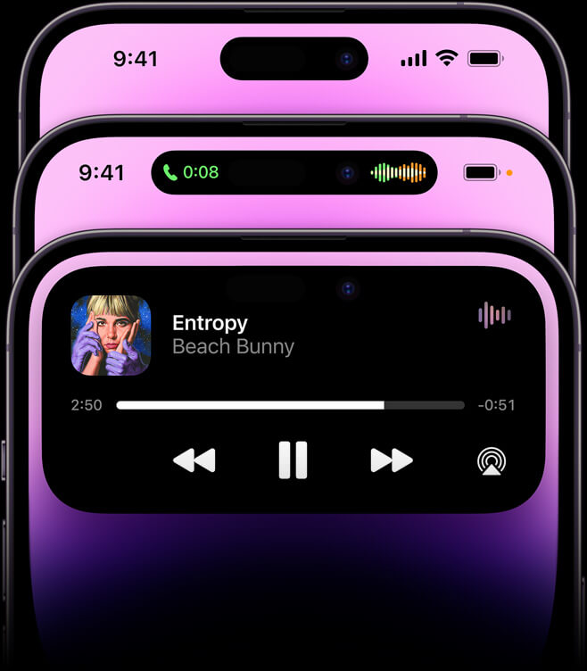 다이내믹 아일랜드를 채택되었는데 아주 편리하게 사용될 것 같아요. 무음, 음악재생, 녹음, 카메라 등